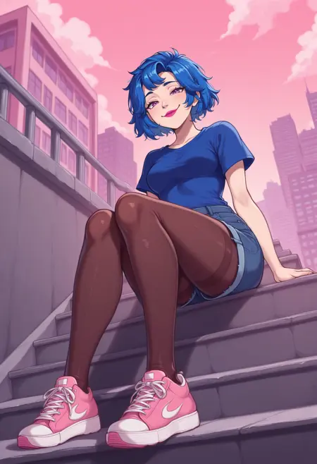 其他服装主提示词: "NSEmilyMisc,蓝色头发,紫色眼睛,口红,短发"