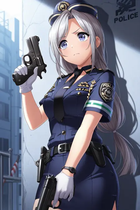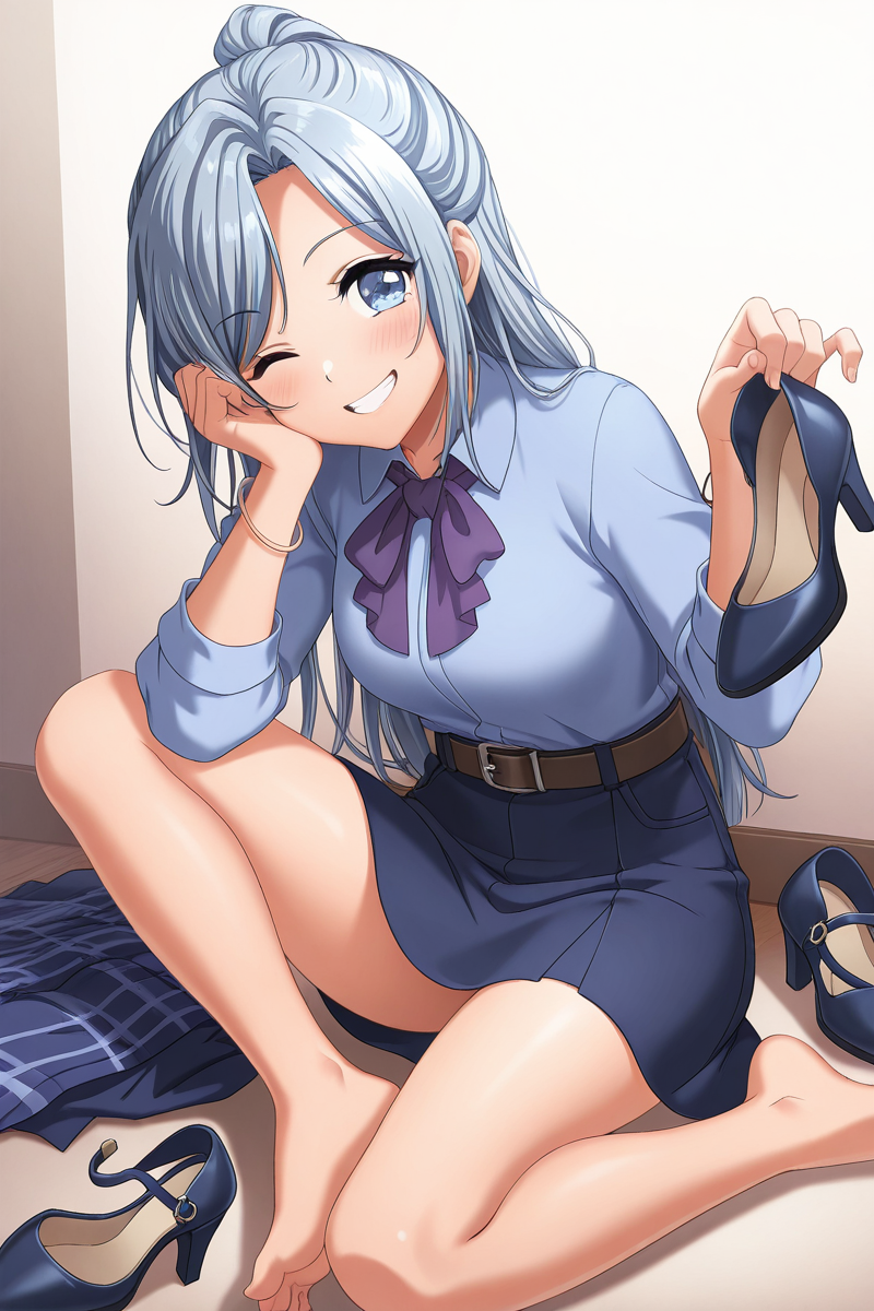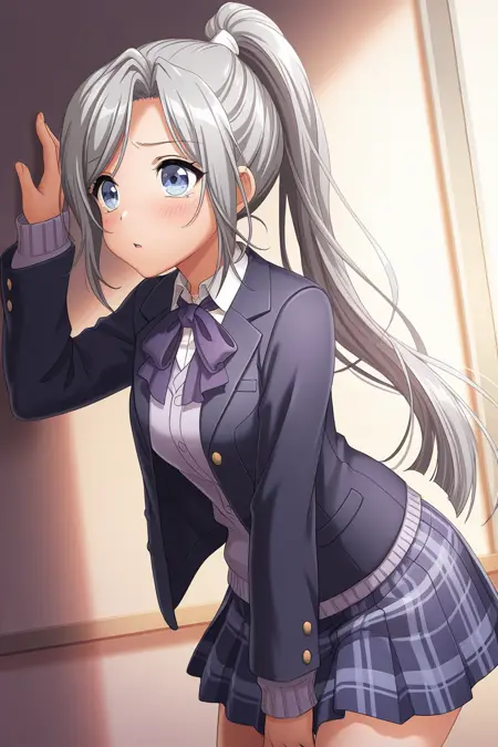 ibuki, 1girl, solo, skirt, school uniform, jacket, blazer, ponytail, grey hair, long hair, blue eyes, pleated skirt