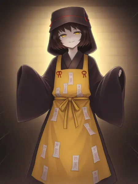 카게쓰무기, 단발, 갈색 머리, 노란 눈, 검은 기모노, 매우 긴 소매, 넓은 소매, 손목을 넘어가는 소매, 후드, 노란 앞치마, 오후다, (앞치마에 오후다),