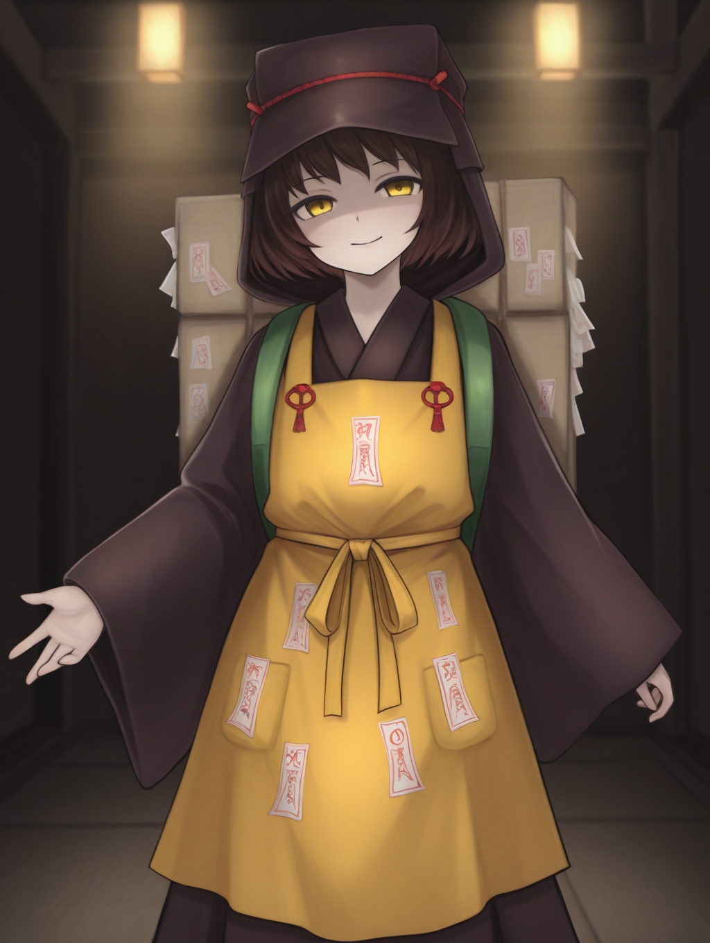 Kagetsumugi, short hair, brown hair, yellow eyes, black kimono, very long sleeves, wide sleeves, sleeves past wrists, hood, yellow apron, ofuda, (ofuda in apron),