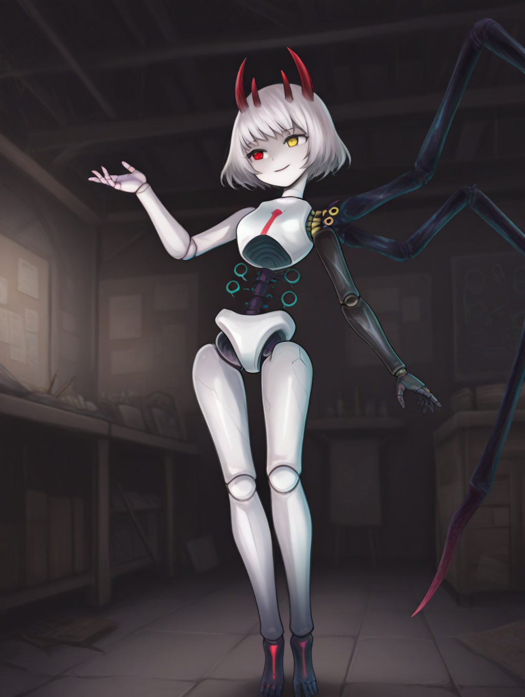 Kagetsumugi, Kagepuppet, short hair, white hair, yellow eyes, red eyes, heterochromia, horns, doll joints, nude, one arm, prosthetic arm, insect_legs, shoulder decoration, white body,