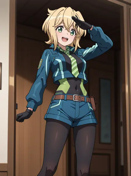 SONG uniform :SongUniform striped necktie, black pantyhose, blue_shorts, belt standing blue_jacket,navel, black_gloves smile, covered navel, closed_jacket