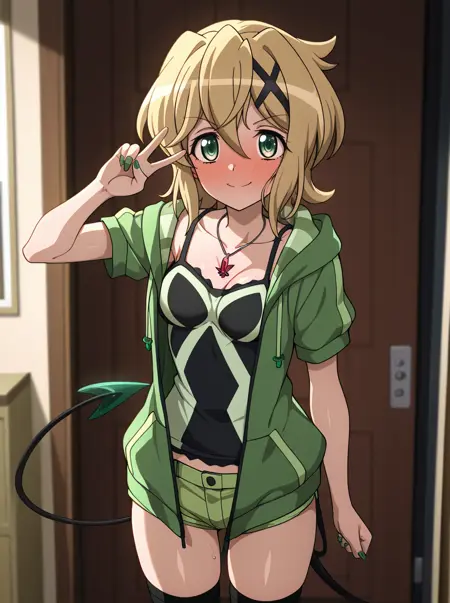Casual GX Look: CasualGX green hoodie, short sleeves, partially_open_hoodie, black camisole, x camisole, green short shorts,demon tail, black thighhighs