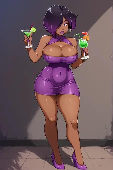 dark-skinned female, very dark skin, short hair, hair over one eye, bob cut, black hair, purple hair, multicolored hair, two-tone hair, gradient hair, brown eyes, large breasts, lipstick, makeup, eyeshadow, purple lipsAttire