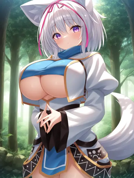 1girl,animal ears,breasts,solo,tail,large breasts,underboob,white hair,wolf ears,purple eyes,short hair,steepled fingers,standing,looking at viewer,own hands together,ribbon,nico,