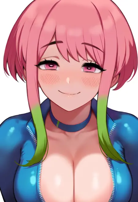 Arie:1girl, arie, 粉发, 短发带长发绺, 渐变发色, 粉眼, 刘海, 短发, 绿色侧发, 蓝色紧身衣, 拉链, 项圈
