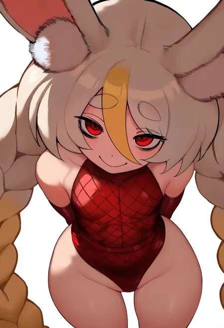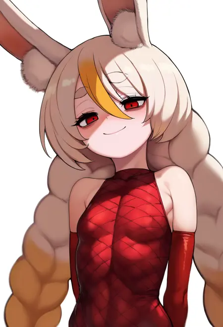 Alma:1girl, alma, 兔子耳朵, 长发, 金发, 兔子女孩, 动物耳朵绒毛, 红眼, 双马尾, 发丝遮眼, 红色肘部渔网手套, 红色渔网紧身衣