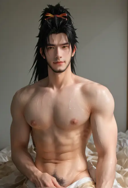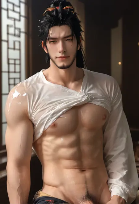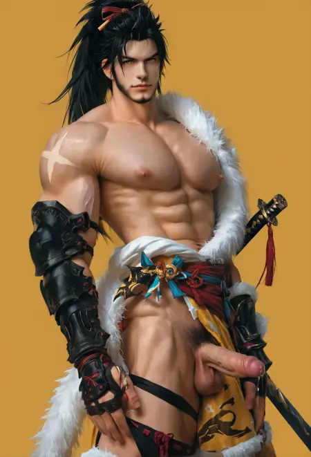 玄日仁,面部毛发,马尾辫,肌肉发达,黑发,长发,胡子,剑,宽大胸肌,盔甲,嘴唇,疤痕,无指手套,黄眼睛