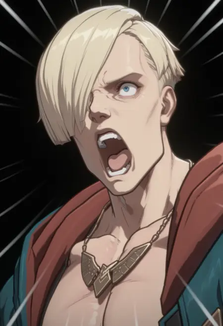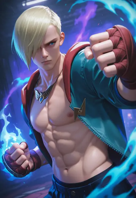 sf6ed, 1boy, solo, male focus, blue eyes, short hair, blonde hair, hair over one eye, || hood, open clothes, jewelry, open jacket, necklace, abs, fingerless gloves, navel, || pants, denim, jeans, || boots