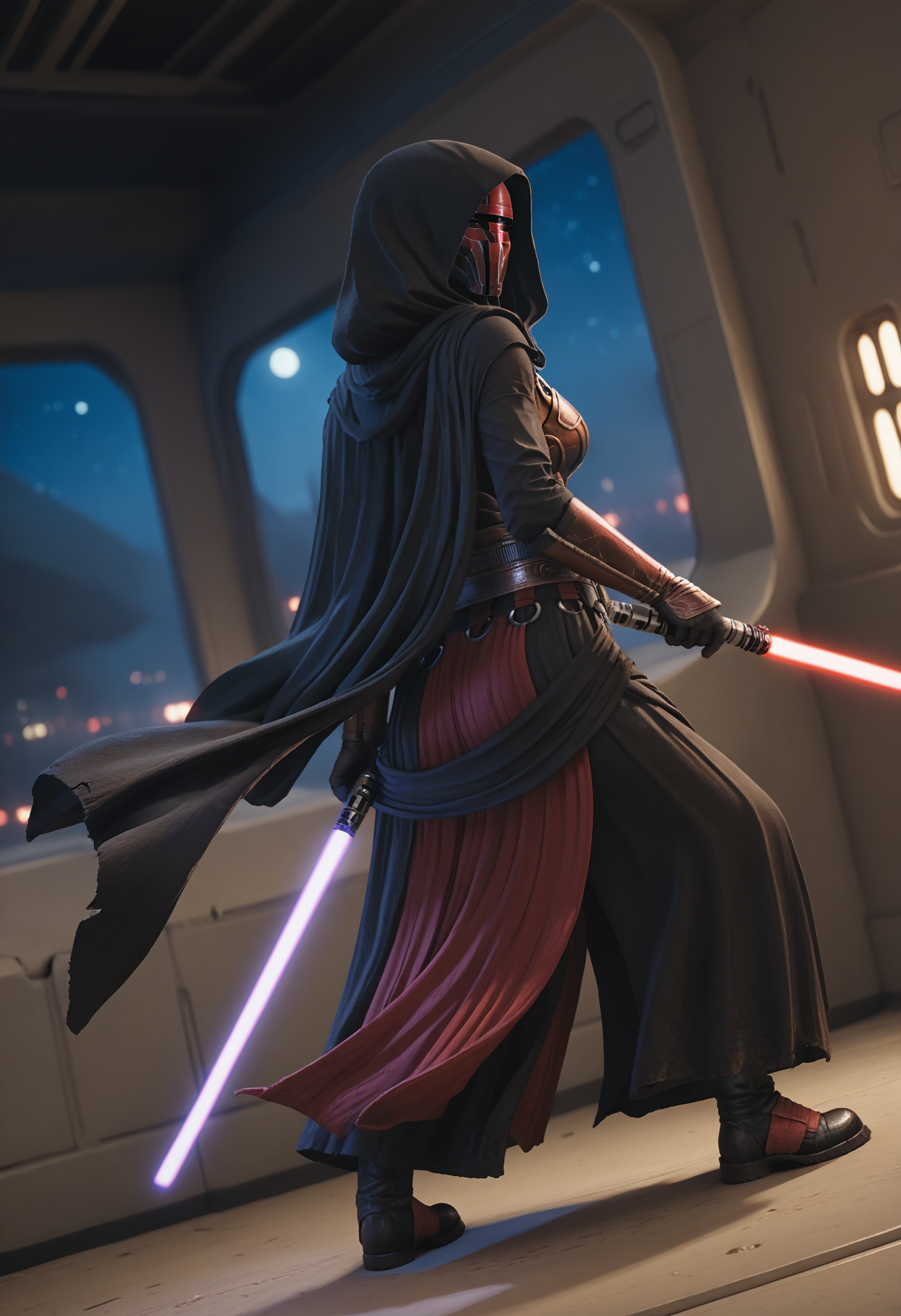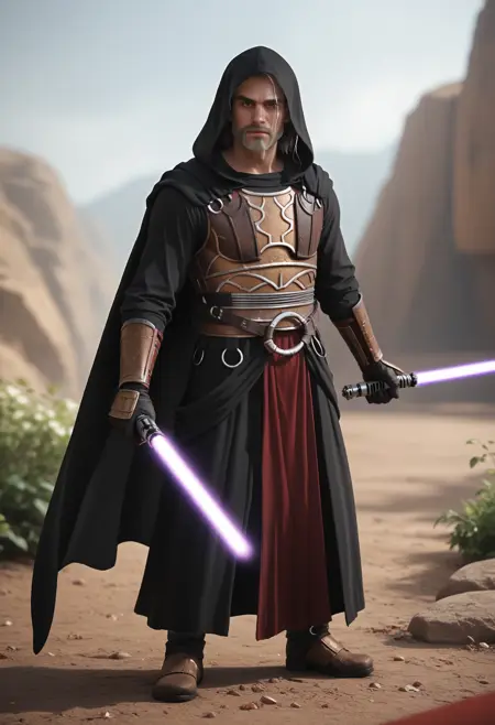 Secondary: holding lightsaber, dual wielding, purple lightsaber, red lightsaber,