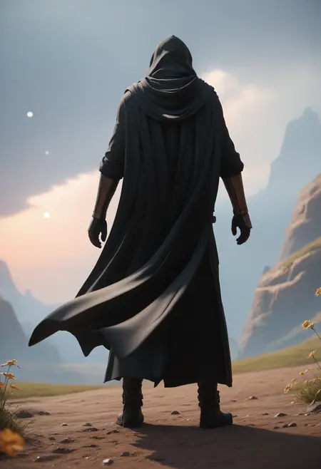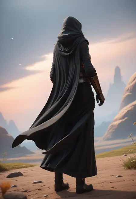 Primary: d4rkr3v4n4rm0r, black robe, cape, hood up, mandalorian helmet, breastplate, gauntlets, belt, pants, belt boots,