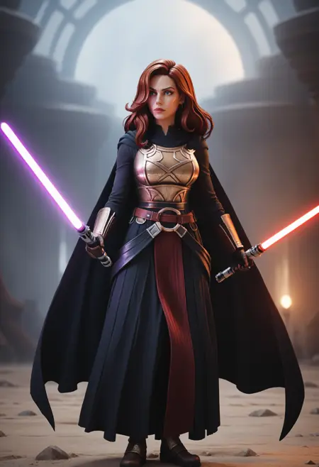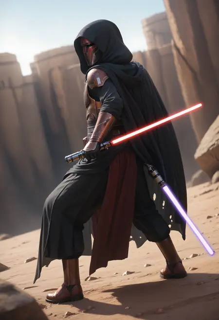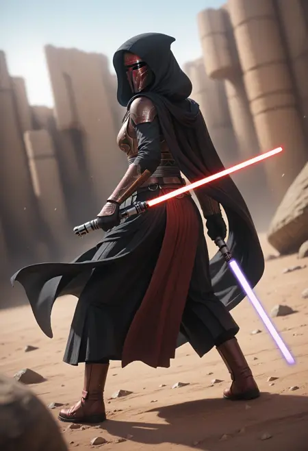 Secondary: holding lightsaber, dual wielding, purple lightsaber, red lightsaber,