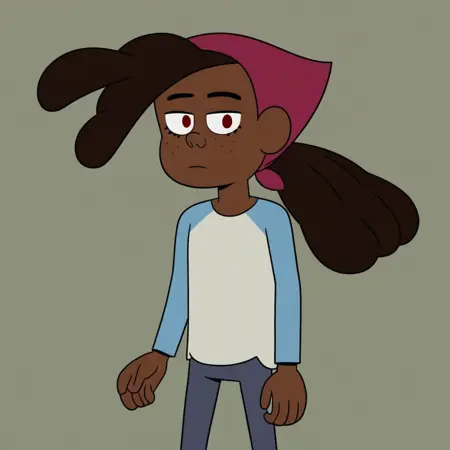 1girl, Solo, Maya_Cotc, brown skin, dark red eyes, freckles, thick hair, hairstyle ponytail, dark brown hair, magenta bandana on hair