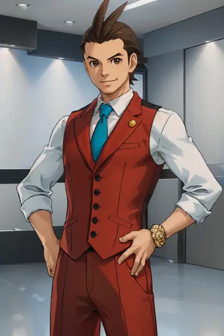 Default Outfit: white shirt, blue necktie, sleeves rolled up, red vest, red pants, jewelry, bracelet