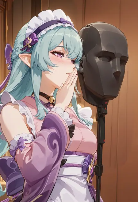 genshin impact, gnshnymmzkmzk, bangs, long hair, maid headdress, medium breasts, pointy ears, purple bow, purple eyes, green hair