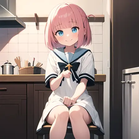 머리/주요 특징: 단발, 파란 눈, 분홍색 머리, (양쪽 올림)