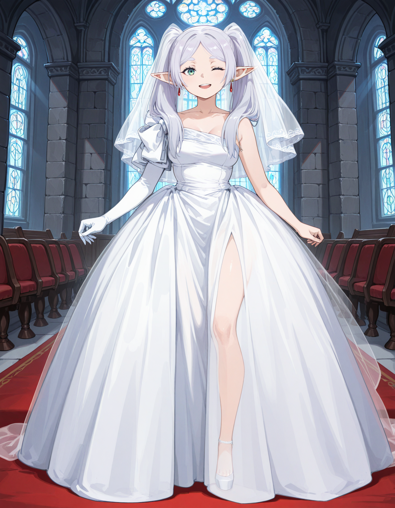 asymmetrical shoulders, poofy sleeve, long dress, dress, slit dress, strapless, lace short gloves