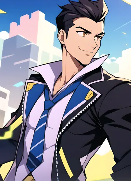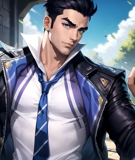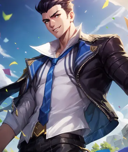トリガー語: lora:Battle_Academia_Jayce:0.7, battle academia jayce, solo, 短い髪, 黒髪, 1boy, ジャケット, 白いシャツ, 男性中心, 黒手袋, ワンポイントシャツ, 厚い眉, 青いネクタイ