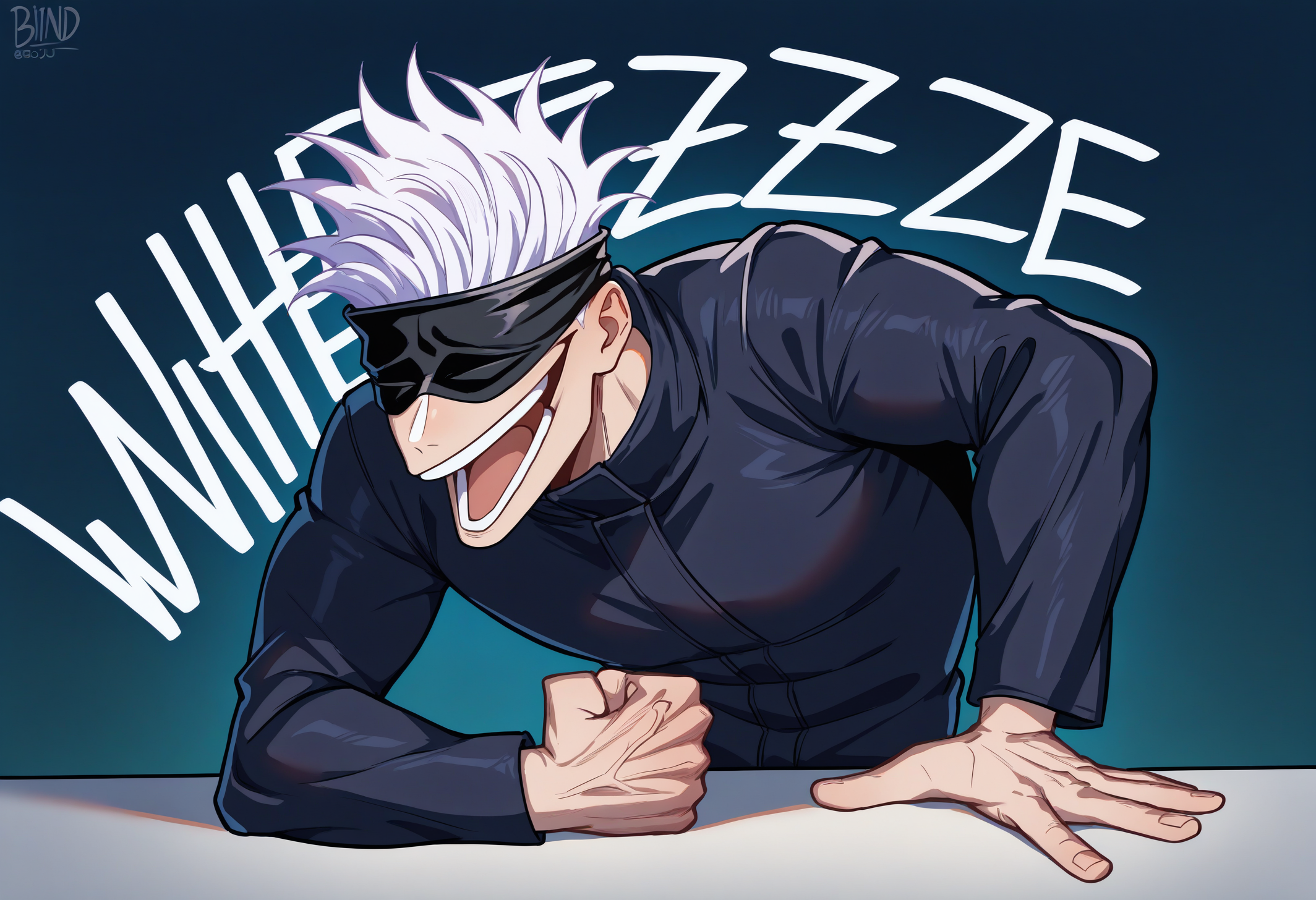 wheeze, upper body, laughing, tears, clenched hand, crying, english text, hand on table, open mouth