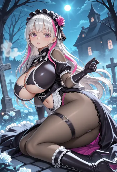 poppydef,maid headdress,multicolored hair,pink hair,white hair,long hair,purple eyes,goth fashion,see-through,apron,frills,underwear,clothing cutout,huge breasts,highleg,black gloves,navel,long skirt,black pantyhose,high heel boots, white eyelashes,heart o-ring,
