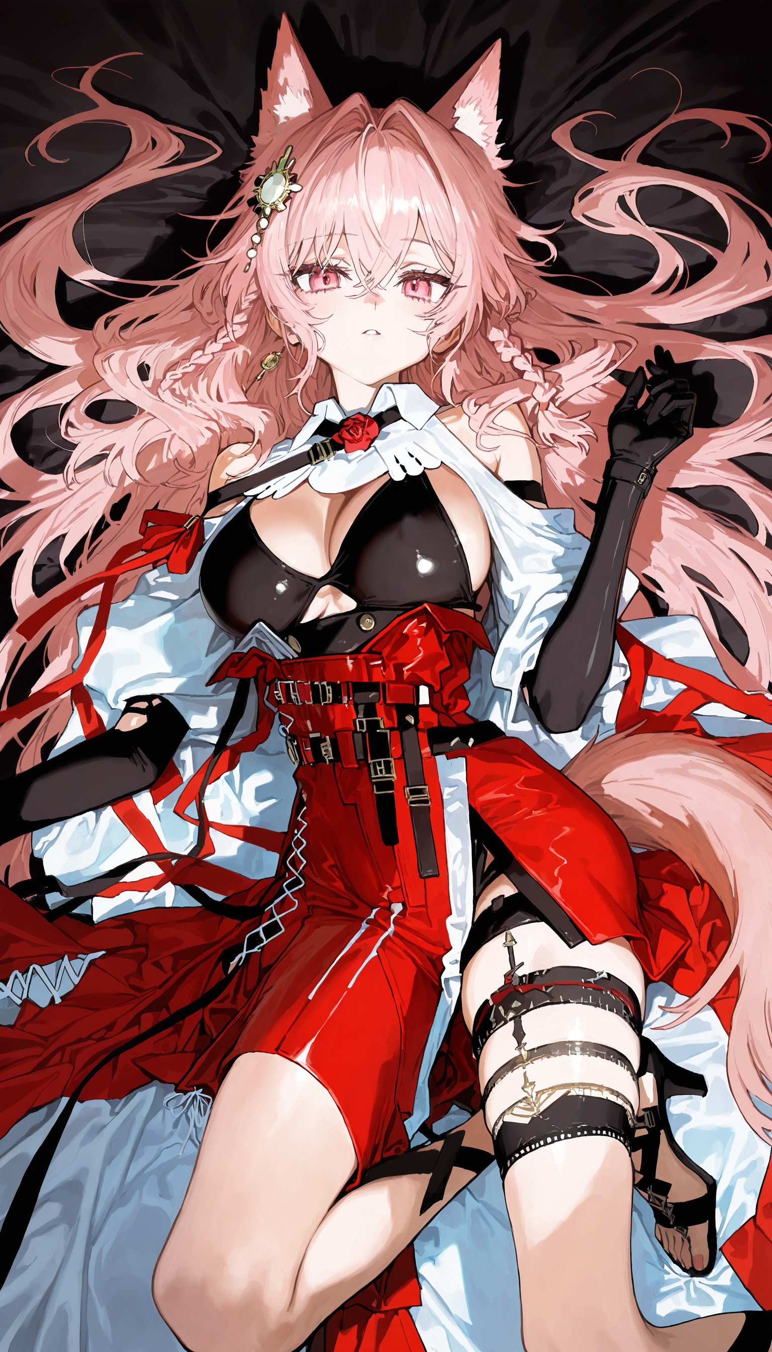 pink hair,pink eyes, braid, wolf tail,wolf ears,