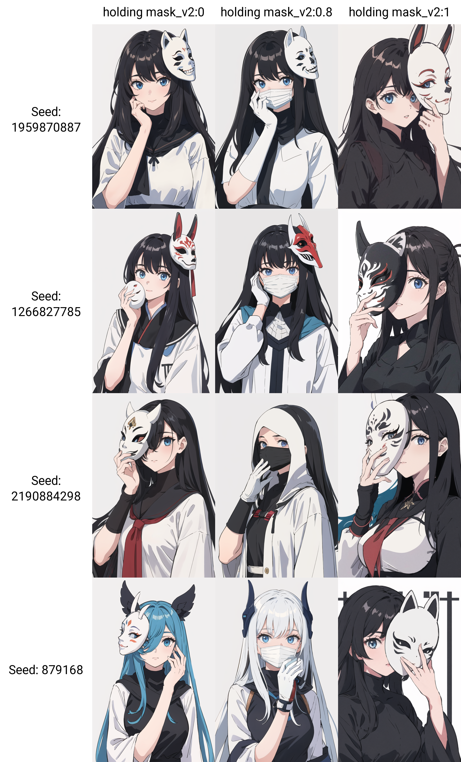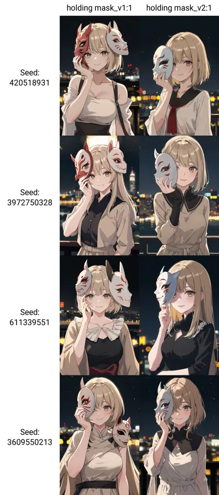 在使用此 Lora 时尽可能描述面具类型,例如狐狸面具之类的:“fox mask”,“skull mask”,“cat mask”等等,这样可以避免生成一些奇奇怪怪形状的东西。