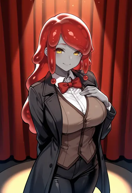 外見: slime girl, grey skin, long hair, red hair, yellow eyes