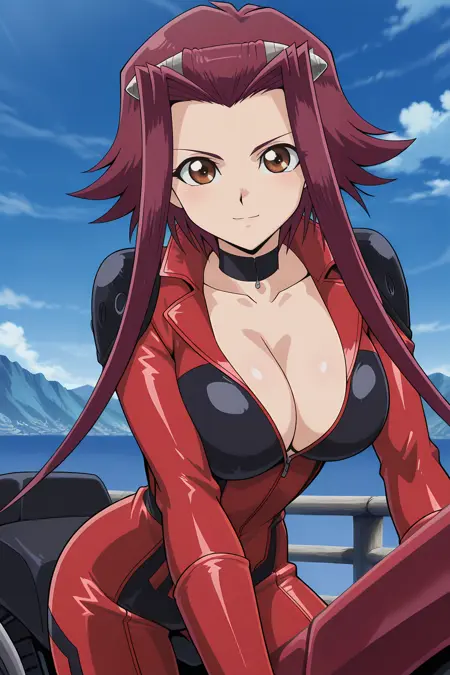bikesuit, bodysuit, cleavage, biker clothes, choker, red bikesuit,