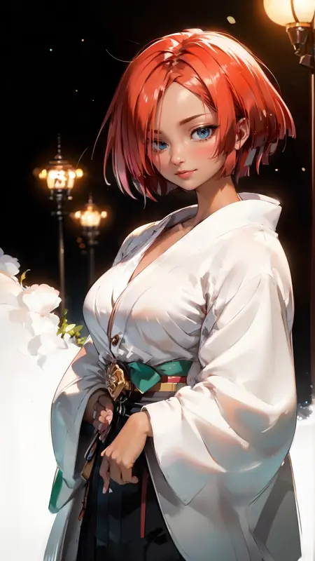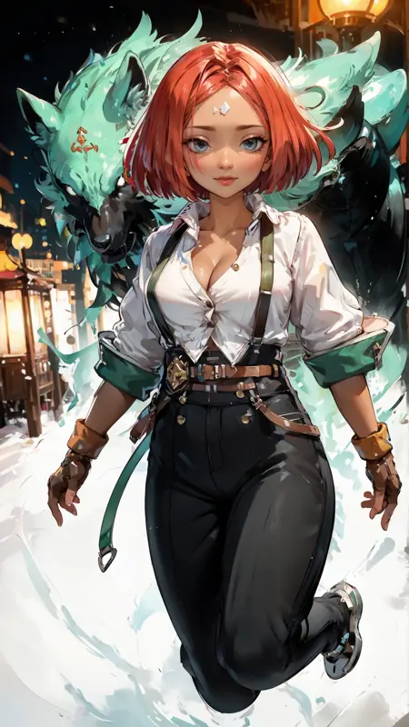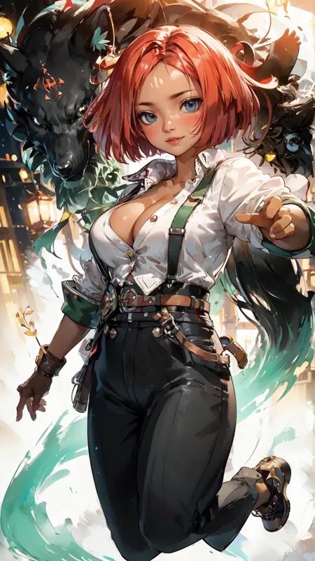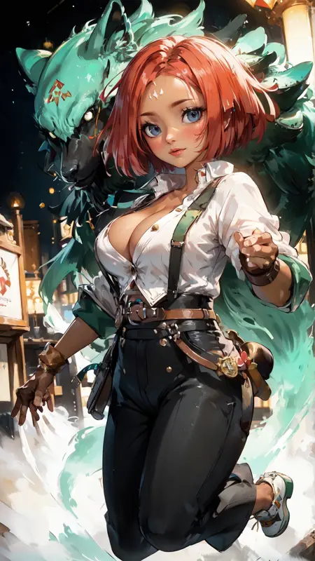 例: "giovanna_strive, an anime girl, 1girl, breasts, short hair, blue eyes, gloves, white background, full body, red hair, belt, dark skin, fingerless gloves, dark-skinned female, facial mark, suspenders, 1other, brown gloves, forehead mark, platform footwear, wolf, multiple belts, high-waist pants, platform heels"