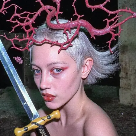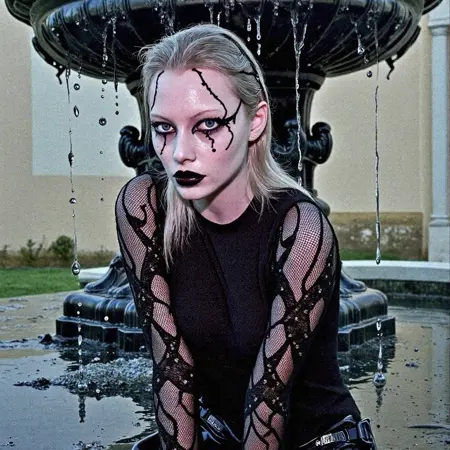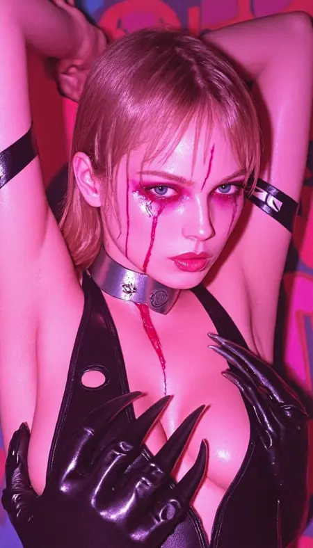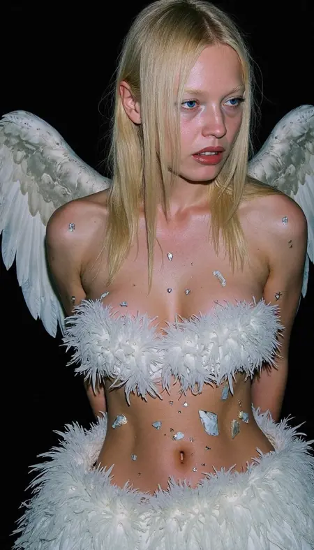 フルフロントフラッシュのまぶしさ、ハードフラッシュ写真、モーションブラー、フィルムグレイン、低角度ショット、ハイキー照明、エッジー、シネマティック、グレインリー、エディトリアル写真、フィルム写真、雑誌表紙、エーテリアルな輝き、動いている、ドラマチックな光、ドラマチックな影、高コントラスト、低照明、など...