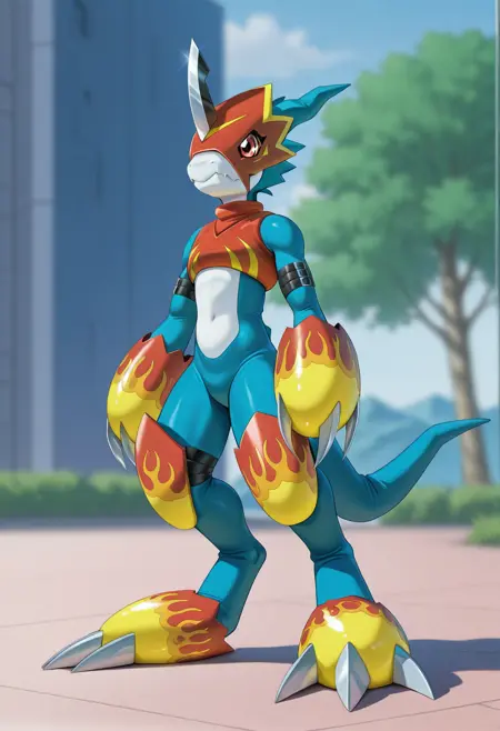 플레임드라몬 (갑옷 미착용): Flamedramon, 벌거벗음, 헬멧, 팔 벨트, 다리 벨트, 파란 몸체