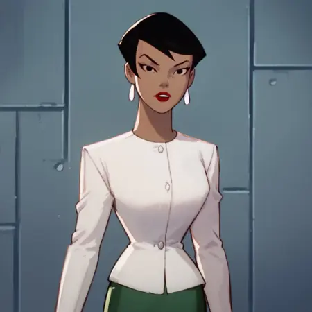 lipstick, black hair, short hair, black eyes, dark skin, cream jacket, green pencil skirt, earrings, Angela Chen (dc)