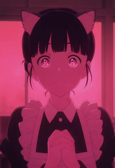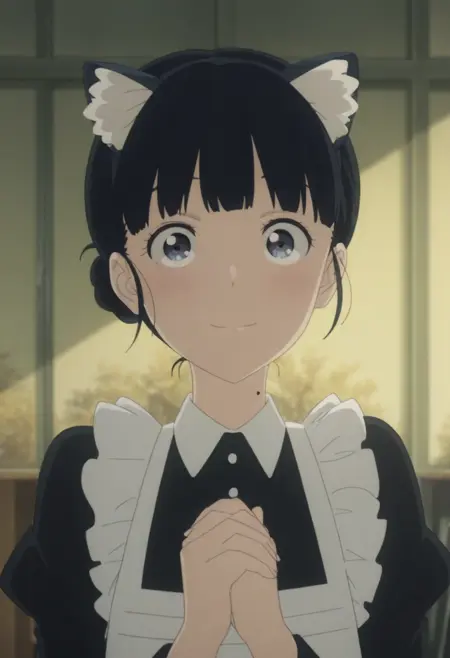 tiara basori, 1girl, black hair, short hair, blunt bangs, single hair bun, mole on neck,