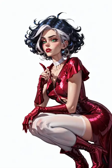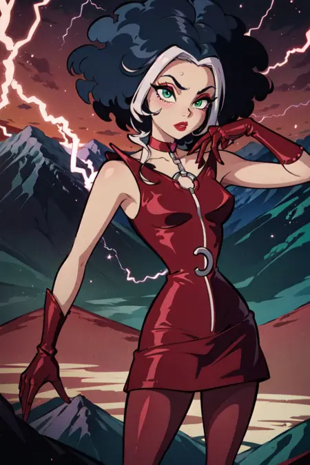 魔女服: (WitchOutfit)、チョーカー、赤いアイメイク、赤い唇、赤いドレス、ピンクのパンティーストッキング、赤いブーツ、手袋