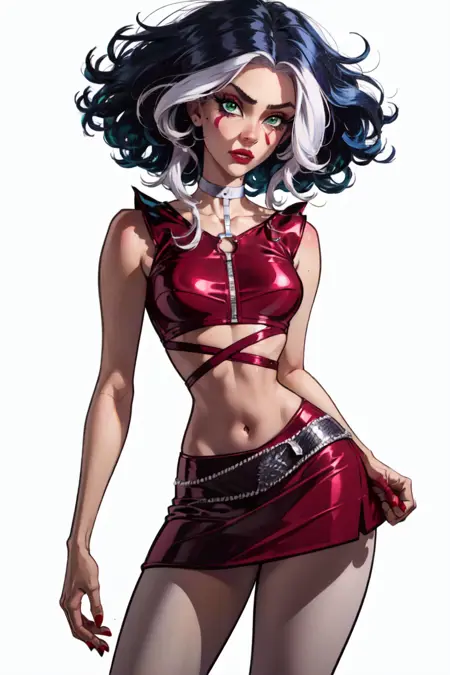 カジュアル服: (CasualOutfit)、赤いキャミトップ、紫色のミニスカート、ハイヒール、チョーカー、シンプルな化粧