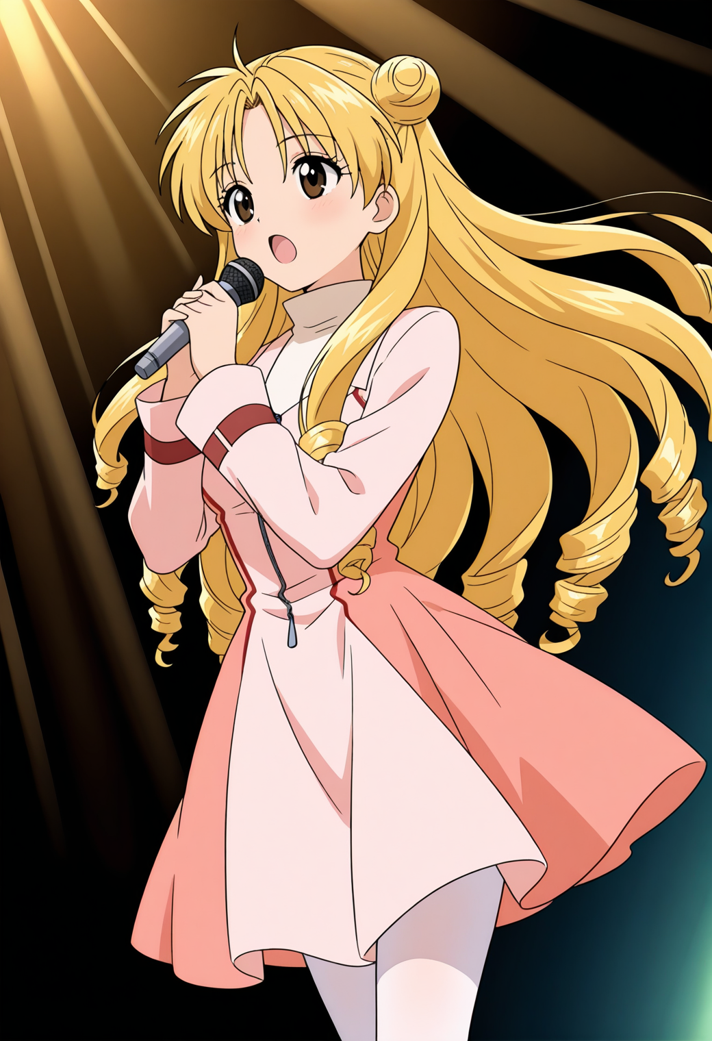 fm_mitsuki, fm_casual, blonde hair, long hair, drill hair, double bun, brown eyes,