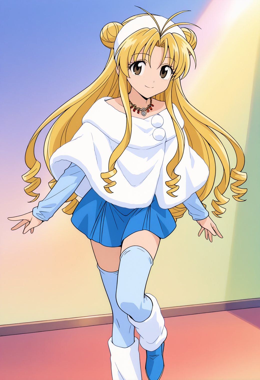 white hairband, fur hairband, necklace, jewelry, white poncho, fur poncho, blue shirt, strapless shirt, thumb hole sleeves, blue miniskirt, blue thighhighs, zettai ryouiki, white leg warmers, blue footwear
