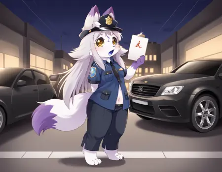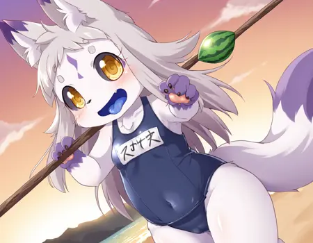 기본 프롬프트: 검은 공막, 노란 눈, 이마 문양, 송곳니, 긴 머리, 어지러운 머리, 흰 털, 보라 털, 다색 털, 파란 입, 여우 귀, 여우 꼬리, 동물 발, 털 하이라이트, 넓은 골반, 두꺼운 허벅지, 배, 여우 발, 키타네, 케모노, 여우