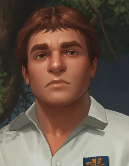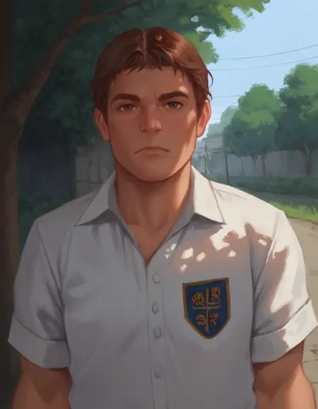 1boy, male focus, solo, shirt, realistic, white shirt, short sleeves, collared shirt, brown hair, pants, uniform, short hair, big, russell northorp,