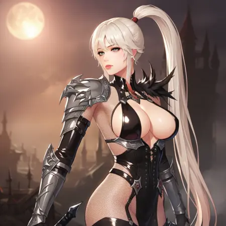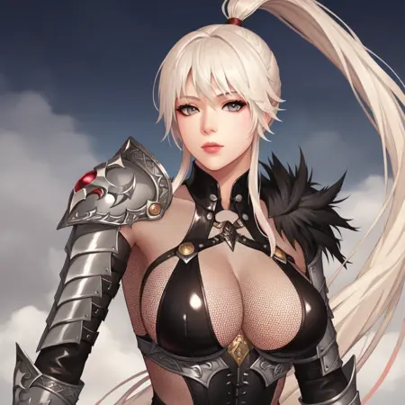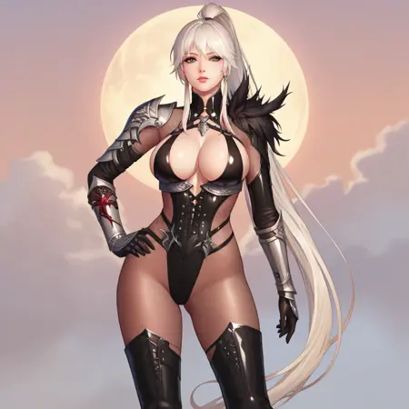 Vindictus_Siete,1girl, solo, very long hair, grey eyes, white hair,ponytail, breasts,fishnets,thighhighs, bodysuit,gloves,large breasts, lips, gauntlets, boots,armor,black fur trim,vambraces,shoulder armor