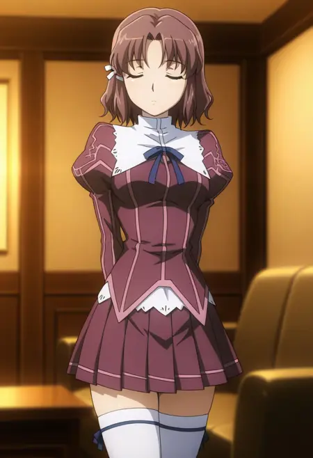 Chiffon Fairchild: 1girl,chiffonf,solo,closed eyes,short hair,brown hair,white ribbon,hair ribbon,school uniform,juliet sleeves,puffy sleeves,long sleeves,skirt,pleated skirt,zettai ryouiki,white thighhighs,