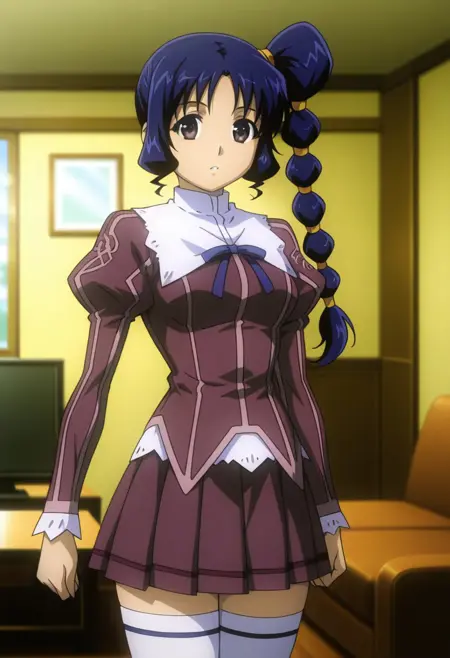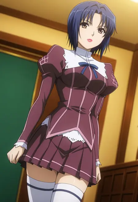 Miyabi Kannazuki: 1girl,miyabikan,brown eyes,blue hair,short hair,lipstick,school uniform,juliet sleeves,puffy sleeves,long sleeves,skirt,pleated skirt,zettai ryouiki,white thighhighs,