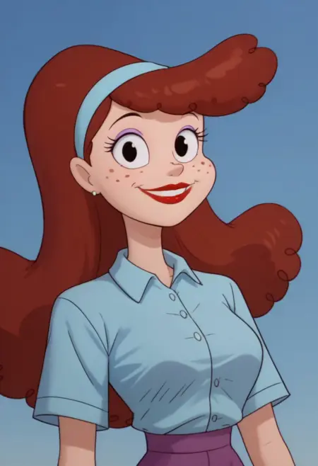 1girl, Solo, Linda_CaC, 밝은 피부, 검은 눈, 짙은 빨간 머리, 길고 곱슬인 머리, 두더지점, 밝은 보라색 아이섀도우, 빨간 입술, 밝은 파란 헤드밴드