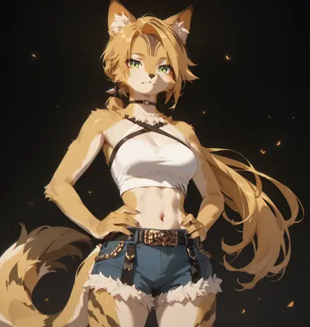 Pulchra, furry, animal ears, blonde hair, long hair, ponytail, green eyes, tail,