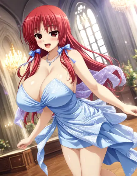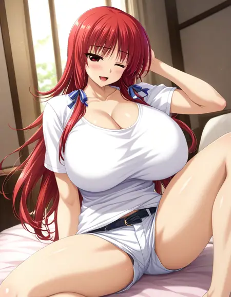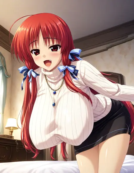 Recommend prompt:Sayaka Renjou, red eyes, red hair, long hair, ahoge, hair ribbon, ahoge, fang,