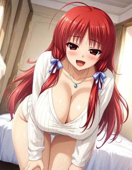 권장 프롬프트: Sayaka Renjou, red eyes, red hair, long hair, ahoge, hair ribbon, ahoge, fang,