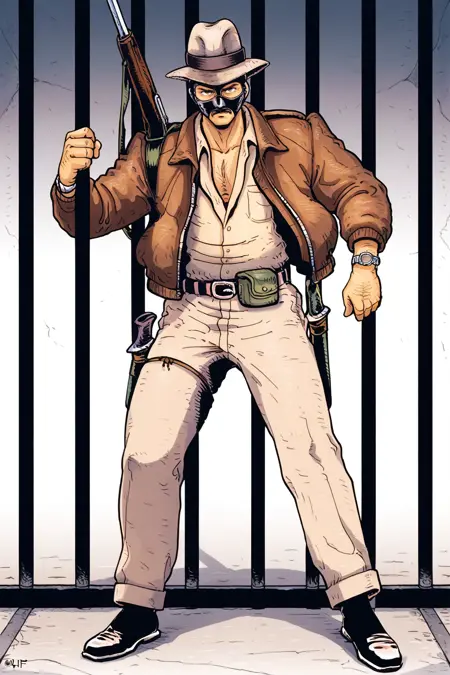 1boy, male focus, mature male, mustache, beige fedora, short hair, grey hair, brown leather jacket, beige shirt, belt, wristwatch, beige pants, black shoes