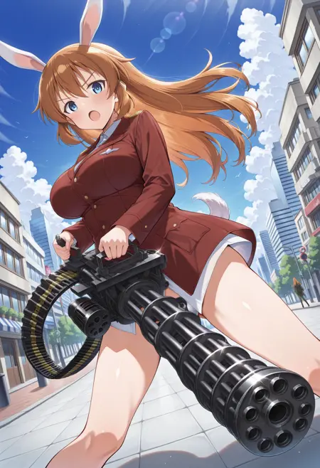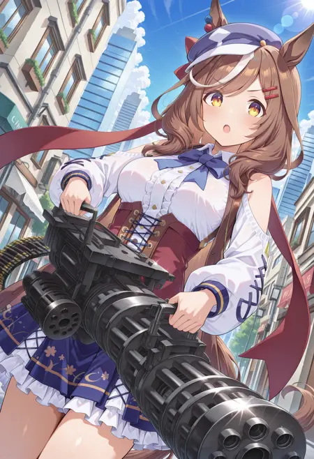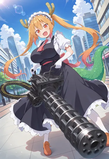 masterpiece, absurdres, newest, 1girl, c-m134, holding m134, two-handed, ammunition belt, tohru \(maidragon\), kobayashi-san chi no maidragon, 1girl, maid, maid headdress, maid, dragon horns, dragon tail, large tail, fang, orange eyes, hair between eyes, red eyes, slit pupils, blonde hair, long hair, orange hair, gradient hair, very long hair, twintails, large breasts, white gloves, elbow gloves, puffy short sleeves, dragon girl, looking at viewer, outdoors, city, day, lens flare, dutch angle, shiny metal, metal,