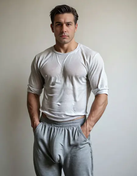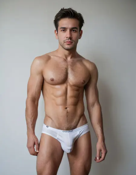 "一位自信的男性模特穿着紧身牛仔裤,细节丰富的布料褶皱、自然阴影与清晰隆起。影棚灯光,电影级景深。"