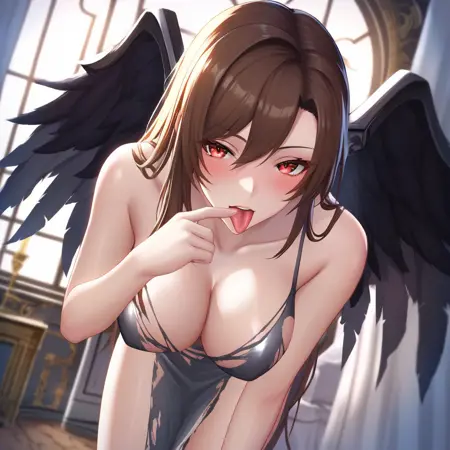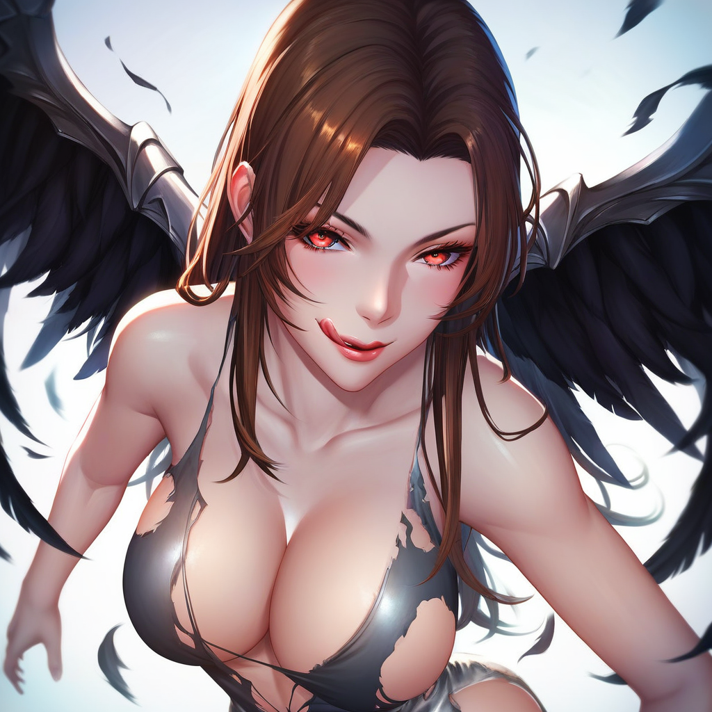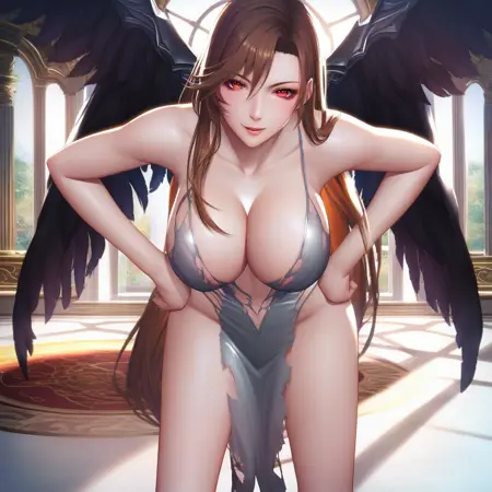 3Phase_Brigit: 3Phase_Brigit, 1girl, 단독, 검은 날개, 가슴, 갈색 머리, 긴 머리, 붉은 눈, 드레스, 골반 커튼, 회색 드레스, 큰 가슴, 젖가슴, 팔 벗음, 찢어진 옷, 다리 벗음, 어깨 벗음, 맨발